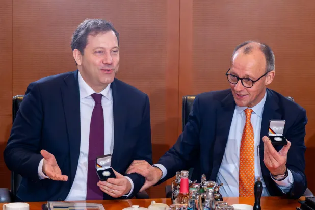 المستشار الألماني فريدريش ميرتس مع نائبه ووزير داخليته ألكسندر دوبرينت خلال الاجتماع الحكومي الأسبوعي في برلين (أ.ف.ب)
