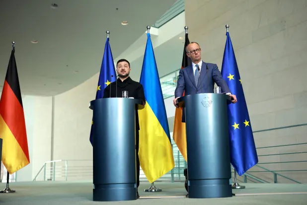 وقال المستشار الألماني فريدريك ميرتس في مؤتمر صحافي مشترك مع زيلينسكي في برلين، إن الدعم الذي تقدمه بلاده لألمانيا «ليس فقط لصالح دفاع أوكرانيا، بل أيضاً لصالح ألمانيا وأوروبا».