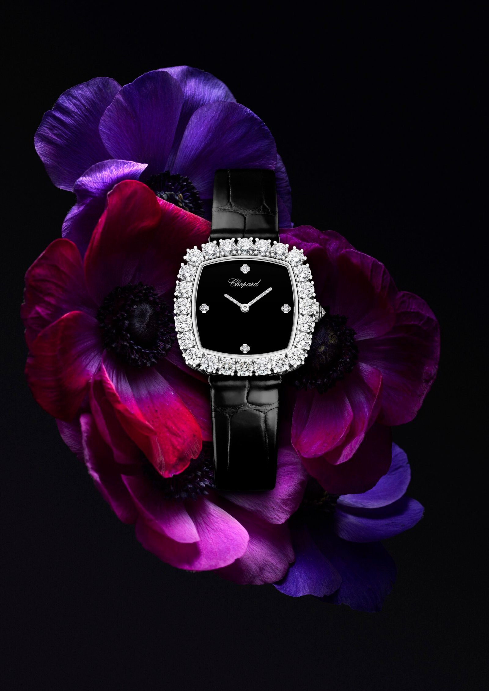 في إصدار L’Heure du Diamant، تبرز شوبارد خبرتها المزدوجة في صناعة الساعات والمجوهرات من خلال قطعة آسرة تجمع بين عمق اللون الأسود وبريق الألماس. تأتي الساعة بعلبة من الذهب الأبيض الأخلاقي بتصميم وسادة، تحتضن ميناءً من الأونيكس الأسود الذي يعكس فخامة هادئة وأناقة لافتة.