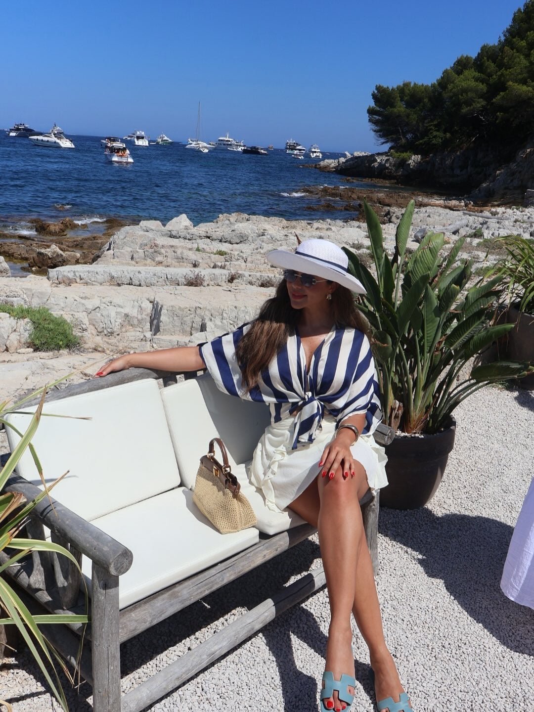 خلال تواجدها على البحر، اعتمدت يارا السكري إطلالة بحرية جذابة، حيث ارتدت قميصاً مقلمًا باللونين الكحلي والأبيض بأسلوب معقود من الأسفل، نسقته مع تنورة قصيرة بيضاء. وأكملت اللوك بحقيبة وحذاء من Hermès، إلى جانب قبعة بيضاء كبيرة منحت الإطلالة طابعاً صيفياً مثالياً.
