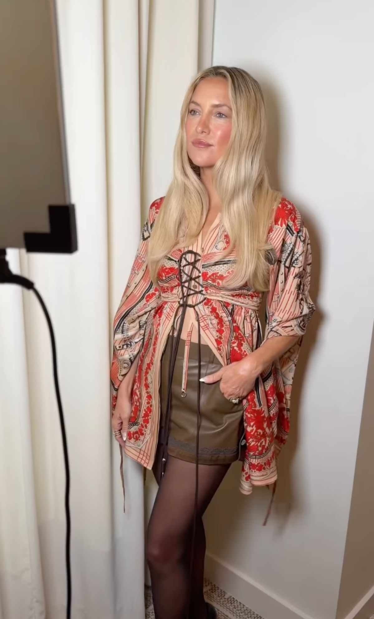 وبرز هذا الزي، المُستوحى مباشرةً من مجموعة هيرميس لربيع وصيف 2026، ببلوزة بوهيمية بنقشة زهور جريئة باللون الأحمر. إلى جانب تفاصيل الأزرار الدقيقة على طول الجزء الأمامي، تميزت البلوزة برباط أمامي طويل يتدلى أسفل كعبيها، ارتدته هدسون بشكل فضفاض لتُظهر شورتها القصير. وكشفت الإضاءة القوية عن تفاصيل الدانتيل الرمادي على حافة شورت هدسون البني القصير، وهي تفاصيل رقيقة ربطت القطعتين معًا بشكل أنيق.