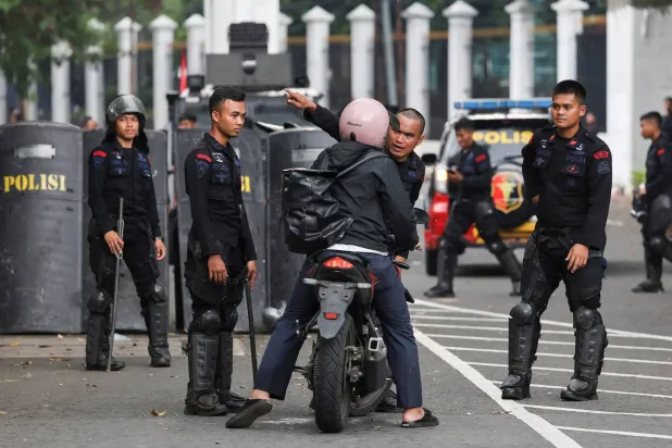 يقف رجال شرطة مكافحة الشغب حراساً أمام مقر لواء الشرطة المتنقل عقب احتجاجات في جاكرتا (إ.ب.أ)