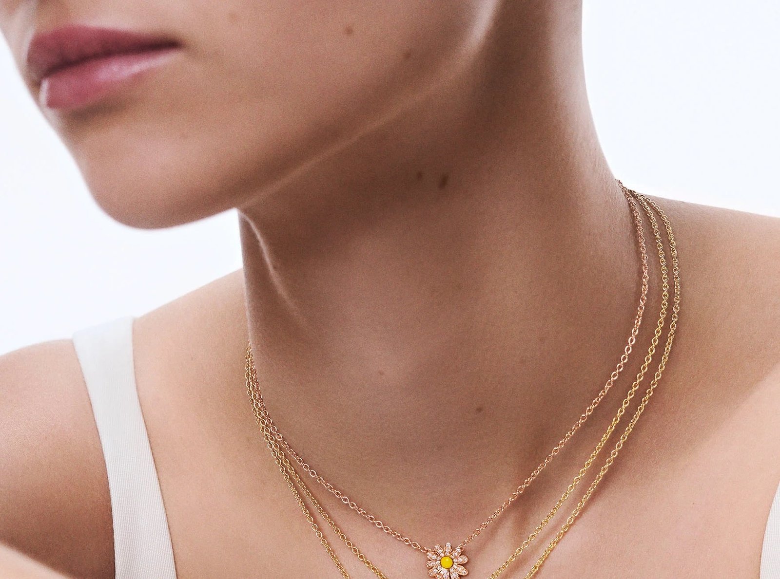 وتحضر زهرة الأقحوان في مشهدٍ مفعم بالبهجة، متناغمةً مع رموز الحظ التي أصبحت توقيعاً جمالياً للدار، وفي مقدّمها النحلة. وتُرصّع هذه العناصر على صفٍ من اللآلئ، لتعزّز الطابع الراقي للتصاميم. أما المفاجأة الختامية فتتمثل في زهرة البرسيم والدعسوقة والأقحوان المرصّعة بالماس، المتألقة على سلاسل رفيعة من الذهب الأصفر أو الوردي، لتغدو رموزاً ثمينة تُلازم صاحبتها وتبقى قريبة من القلب دائماً.