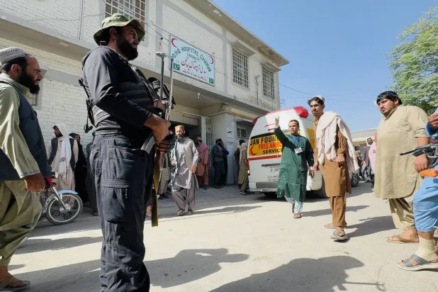 يقف الناس خارج مستشفى في انتظار وصول نعوش العمال الباكستانيين الذين قُتلوا على الجانب الأفغاني من الحدود في اشتباكات بين «طالبان» وقوات الأمن الباكستانية في تشامان بباكستان – 16 أكتوبر 2025 (إ.ب.أ)