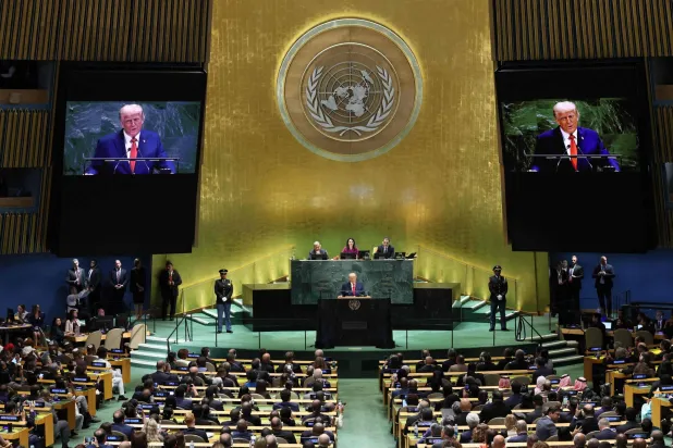 الرئيس الأميركي دونالد ترمب يشير بيده بعد الانتهاء من كلمته في الأمم المتحدة بنيويورك (أ.ف.ب)