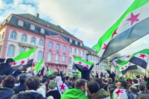 سوريون في ألمانيا رفعوا علم سوريا في برلين ترحيباً بزيارة الرئيس السوري أحمد الشرع والوفد المرافق (أ.ف.ب)