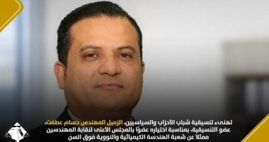 هنأت تنسيقية شباب الأحزاب والسياسيين، الزميل المهندس حسام عطفت، عضو التنسيقية، بمناسبة اختياره عضوًا بالمجلس الأعلى لنقابة المهندسين، ممثلًا عن شعبة الهندسة الكيميائية والنووية فوق السن.