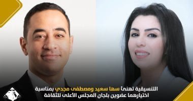 تهنئ تنسيقية شباب الأحزاب والسياسيين عضويها، سها سعيد، عضو مجلس الشيوخ عن الفصل التشريعي الأول، والدكتور مصطفى مجدي، مساعد وزير الشباب والرياضة للشؤون الاستراتيجية والمعلومات، بمناسبة اختيارهما عضوين بلجنتي ثقافة الطفل والشباب ضمن التشكيل الجديد للجان المجلس الأعلى للثقافة.