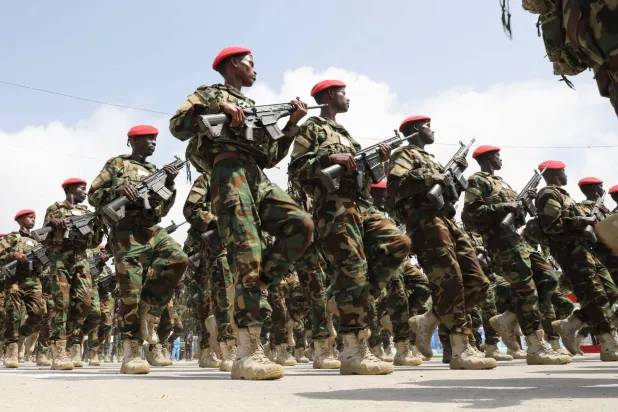 حراس السجون الصوماليون يستعرضون خلال الاحتفالات بالذكرى الخامسة والستين لاستقلال الصومال في مقديشو 1 يوليو 2025 (رويترز)