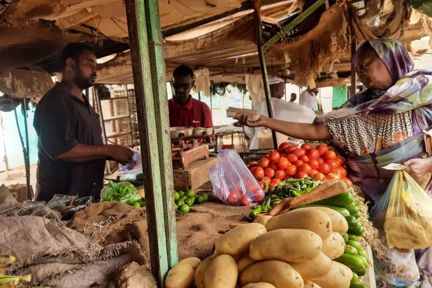 في أزقة السوق الضيقة المتربة تتراكم الفواكه والخضراوات على أكشاك مؤقتة أو أغطية بلاستيكية على الأرض. لم تعد الخرطوم، التي أنهكتها المعارك وحُوصرت بعض أحيائها لأشهر، مهددة بالمجاعة التي تجتاح ساحات المعارك في مناطق أخرى. ولكن مع انهيار الاقتصاد ما زال توفير احتياجات الحياة اليومية أمراً صعباً.