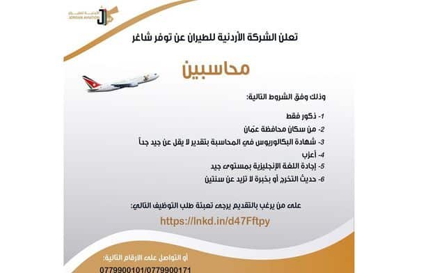 تعلن الشركة الأردنية للطيران عن توفر شاغر (محاسبين):