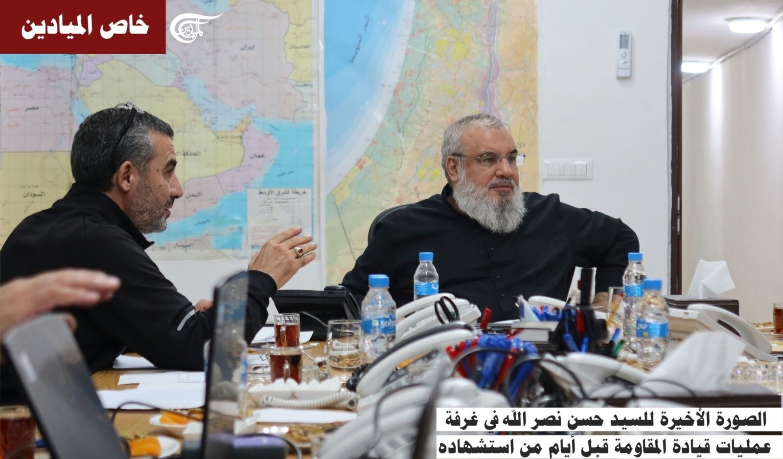 نشرت قناة الميادين آخر صورة للأمين العام لحزب الله الشهيد السيد حسن نصر الله، التُقطت داخل غرفة عمليات قيادة المقاومة قبل أيام قليلة من استشهاده، وإلى جانبه أمين سر المجلس الجهادي الشهيد القائد محمد حبيب خير الدين (الحاج حسن).