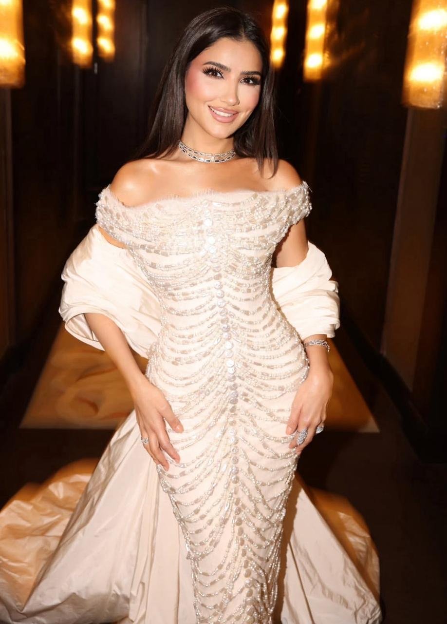تميزت مي عمر بفستان أبيض أنيق من تصميم ساره مراد، بقصة أوف-شولدر ضيقة ومطرزة بالكامل، ما أضفى للفستان بريقاً فاخرًا وتفاصيل دقيقة تلفت الأنظار. رافق الإطلالة كاب طويل ملفت أضفى حركة وأناقة على اللوك، فيما أكملت مي عمر حضورها بمجوهرات بارزة منحته لمسة فخامة راقية على السجادة الخزامية.