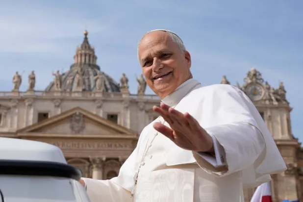 البابا ليو الرابع عشر يحيِّي الحاضرين في ساحة القديس بطرس بالفاتيكان خلال استقلاله السيارة الباباوية (رويترز)