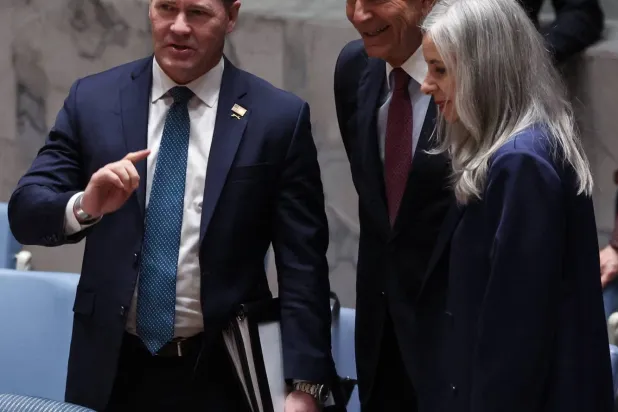 حديث بين سفير الولايات المتحدة لدى الأمم المتحدة مايك والتز مع المبعوث الأميركي الخاص إلى سوريا توم براك قبل اجتماع مجلس الأمن بشأن الوضع في الشرق الأوسط الأربعاء (رويترز)