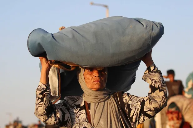 نازح فلسطيني يتجه جنوباً حاملاً أمتعته على طريق في مخيم النصيرات للاجئين وسط قطاع غزة (أ.ف.ب)