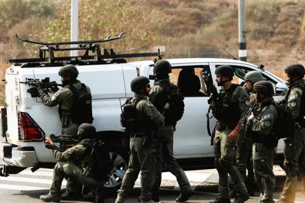 تجمعت قوات الأمن الإسرائيلية في الموقع الذي قُتل فيه شاب فلسطيني برصاص القوات الإسرائيلية عند المدخل الشمالي لمدينة الخليل بالضفة الغربية المحتلة في 14 ديسمبر 2025 (أ.ف.ب )