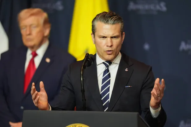الرئيس الأميركي دونالد ترمب (يسار) يتحدث إلى الصحافيين برفقة وزير الدفاع بيت هيغسيث (رويترز)