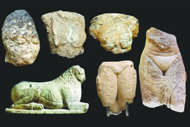 تقابل هذا الليث قطع منحوتة مهشّمة، يشكّل كل منها جزءاً بسيطاً من تمثال أنثوي بات من الصعب تحديد شكل تكوينه الأصلي. تُمثّل إحدى هذه القطع رأساً بقي من ملامحه محجرا العينين الواسعين، والطرف الأسفل للأنف، وشفتا الثغر المطبقتان على ابتسامة خفيّة. الوجنتان عريضتان، وتوحيان بأن هذا الوجه النضر يعود إلى امرأة تعلو رأسها كتلة من الشعر الكثيف، تبلغ مساحتها العليا ضعف مساحة الوجه. في المقابل، تكشف قطعتان منحوتتين عن صدر أنثوي ممتلئ ومكتنز. كما تكشف قطعة ثالثة عن فخذَي ساقين متلاصقتين، تتميّزان كذلك بهذا الطابع المكتنز. حافظت هذه القطعة على قماشتها المصقولة، وهي من الحجم المتوسّط، ويبلغ طولها 70 سنتيمتراً، وعرضها 50 سنتيمتراً، مما يوحي بأنها تعود لتمثال يحاكي في حجمه المثال الطبيعي. حافظت هذه الكتلة الثلاثية الأبعاد على تفاصيل تكوينها، وتُظهر هذه التفاصيل رداءً رقيقاً ينزاح عن الردفين، بقي طرفه حاضراً عند أعلى الفخذ اليسرى. تظهر على هذه الفخذ بقايا كتابة منقوشة بالخط الكوفي، تتجه من الأعلى إلى الأسفل. للأسف، لم يتمكّن أهل الاختصاص من فكّ نص هذه الكتابة، وترى إحدى القراءات الافتراضية أنها تذكر اسم صاحبة هذا التمثال.