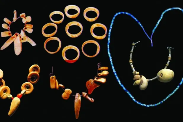 يبرز الطابع المبتكر في عقدين صغيرين يبدوان كذلك أشبه بسوارين، ويتبع كلّ منهما تكويناً مميّزاً خاصاً في جمع فصوصه. يتمثل التكوين الأبسط بستة أقراص مسطّحة شبه متساوية في الحجم، يخرق كلاً منها في الوسط ثقب دائري مركزي، وتعود هذه الأقراص في الأصل إلى محارة كبيرة ذات تكوين مخروطي. تنقسم هذه الأقراص إلى مجموعتين تفصل بينها خرزتان من العقيق الأحمر وخرزتان زجاجيتان من اللون الأخضر الزيتي. تشكّل هذه الأقراص وهذه الفصوص عقداً تتدلّى من وسطه قلادة تتمثّل بمحارة كبيرة تم إحداث ثقب في أعلاها لهذه الغاية.