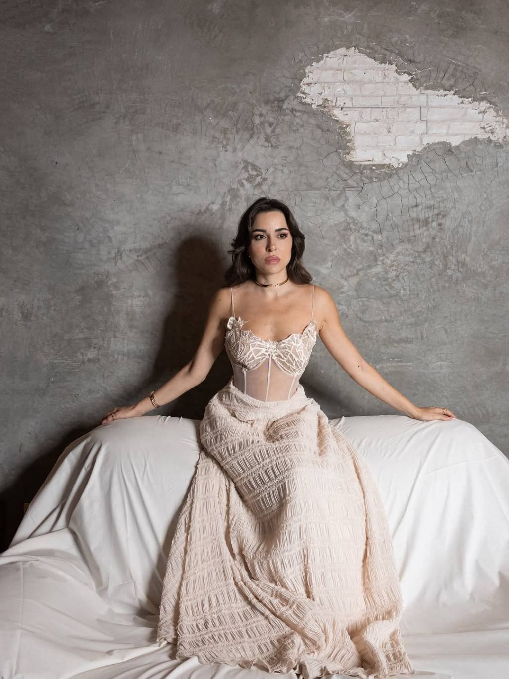 واختارت النجمة اللبنانية فستاناً ناعماً باللون البيج بتفاصيل ملفتة، فجاء من الأعلى بحمالات رفيعة وبقصّة الكورسيه الضيق بقماش شفاف مع تفاصيل انثوية عند منطقة الصدر، بتصميم يشبه “البيبي دول” السائد في عالم الموضة هذا المويم، وينيدل بتنورة طويلة وواسعة تتميّز بطيات قماشها الناعمة في تصميم رقيق يجمع بين الانوثة الصارخة والأناقة الكلاسيكية.