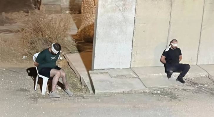وتُظهر الصورة التي انتشرت على نطاق واسع، شابين فلسطينيين معصوبي الأعين ومكبلي الأيدي، يجلس أحدهما على كرسي بلاستيكي متواضع، بينما يجلس الآخر على الأرض بجانب حاجز إسمنتي، تحت أنظار الجنود.