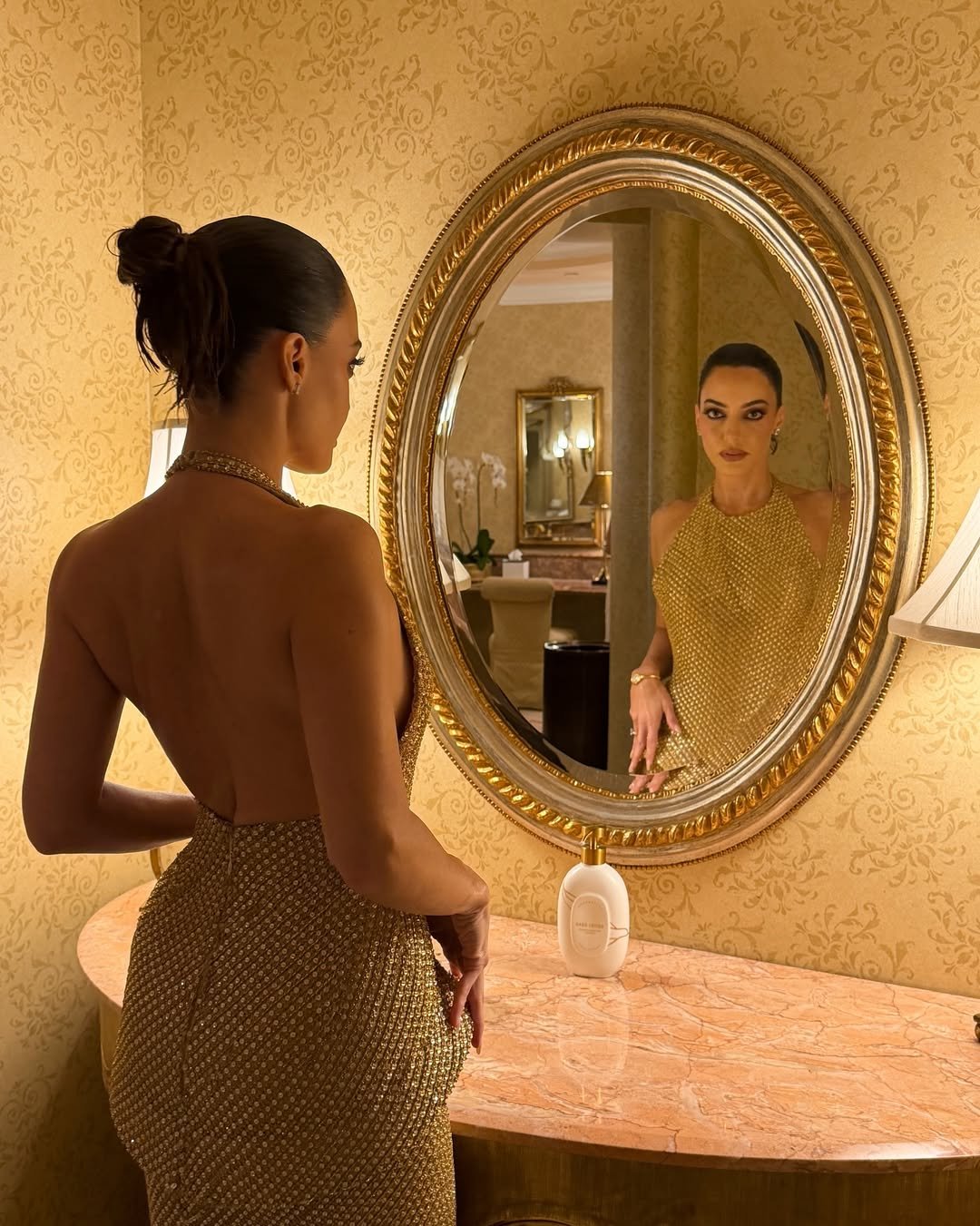 واختارت عارضة الأزياء اللبنانية إطلالة راقية تناسب الحفل الضخم، حمل توقيع المصمم اللبناني-العالمي نيكولا جبران، وتألقت على السجادة الحمراء بفستان باللون الذهبي بقماش لامع مزين بالترتر البراق، وجاء بقصة ضيّقة من الأعلى تبرز قوامها الرشيق، مع ياقة عالية ملتفة حول الرقبة وفتحة جريئة عن الظهر، مع حركة هندسية متومجة عند الورك اضافت لمسة من الفخامة العصرية الأنيقة، لينسدل من الأسفل بشكل مستقيم وتمتد حتى الأرض.
