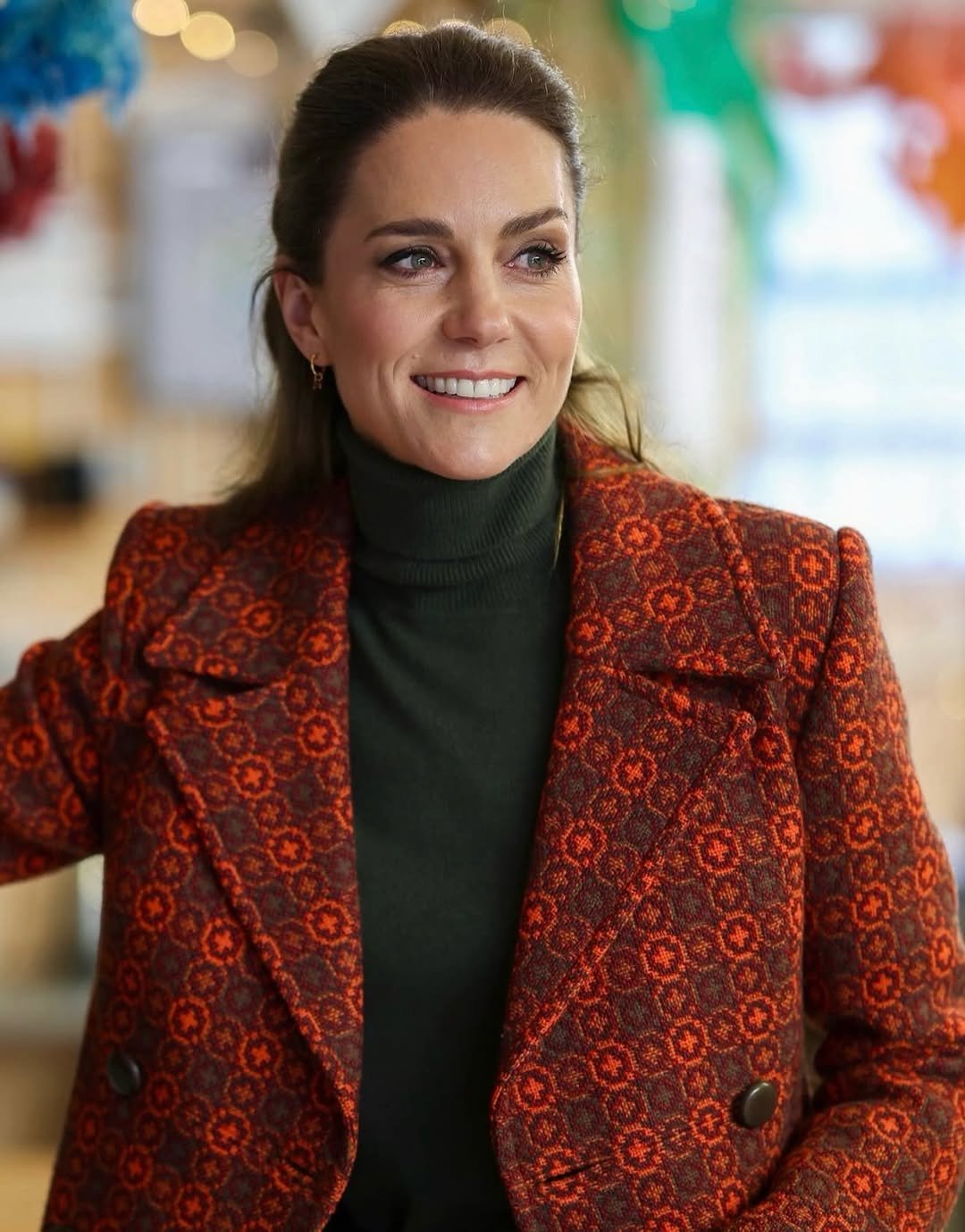كسرت أميرة ويلز قاعدة أناقتها التي التزمت بها طويلًا، واختارت معطفاً مميّزاً يصل إلى حدود الركبة، تميّز بلونه الشتوي الأنيق وبتصميمه الكلاسيكي بنقشة الدوائر الملونة الرائعة، وجاء بياقة حادة وبنية هندسية عند الأكتاف. ونسّقت المعطف مع توب من الصوف بقبة عالية باللون الكاكي مع بنطال واسع الساقين باللون الكاكي من توقيع المصممة فيكتوريا بيكهام.