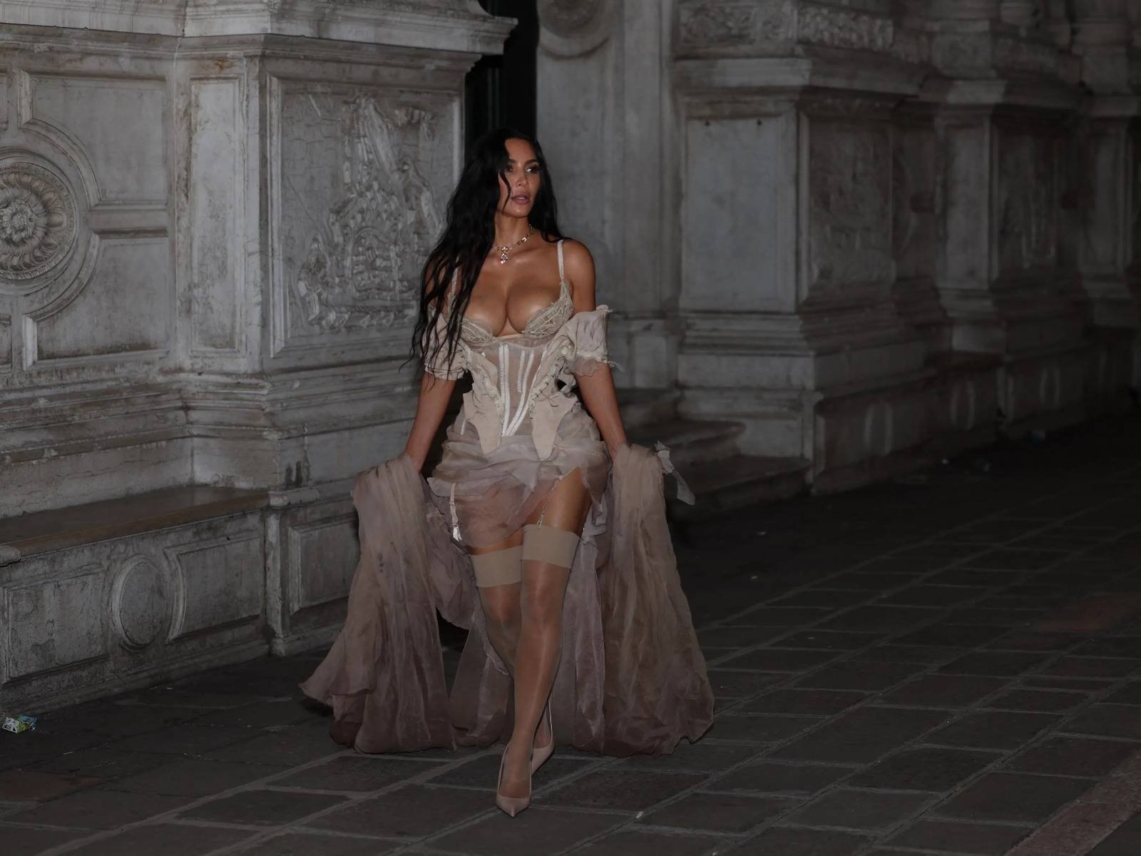 شوهدت نجمة تلفزيون الواقع البالغة من العمر 44 عامًا، وهي تتباهى بجمالها في شوارع مدينة البندقية الإيطالية، في وقت متأخر من ليلة الجمعة، لإجراء جلسة تصوير مع فريقها. ارتدت ملابس داخلية بدرجات البيج والنود من تصميم ديلارا فينديك أوغلو، المصممة نفسها التي صممت فستان زفاف شقيقتها كايلي جينر المثير للجدل.
