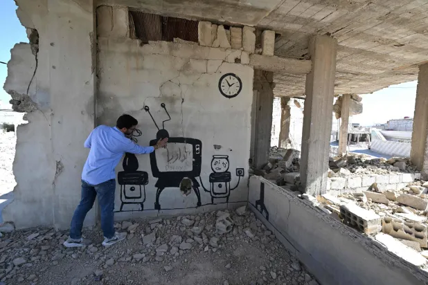 «بانكسي السوري» يشير إلى جدارية رسمها على جدار مبنى قبل فراره من داريا عام 2016 (أ.ف.ب)