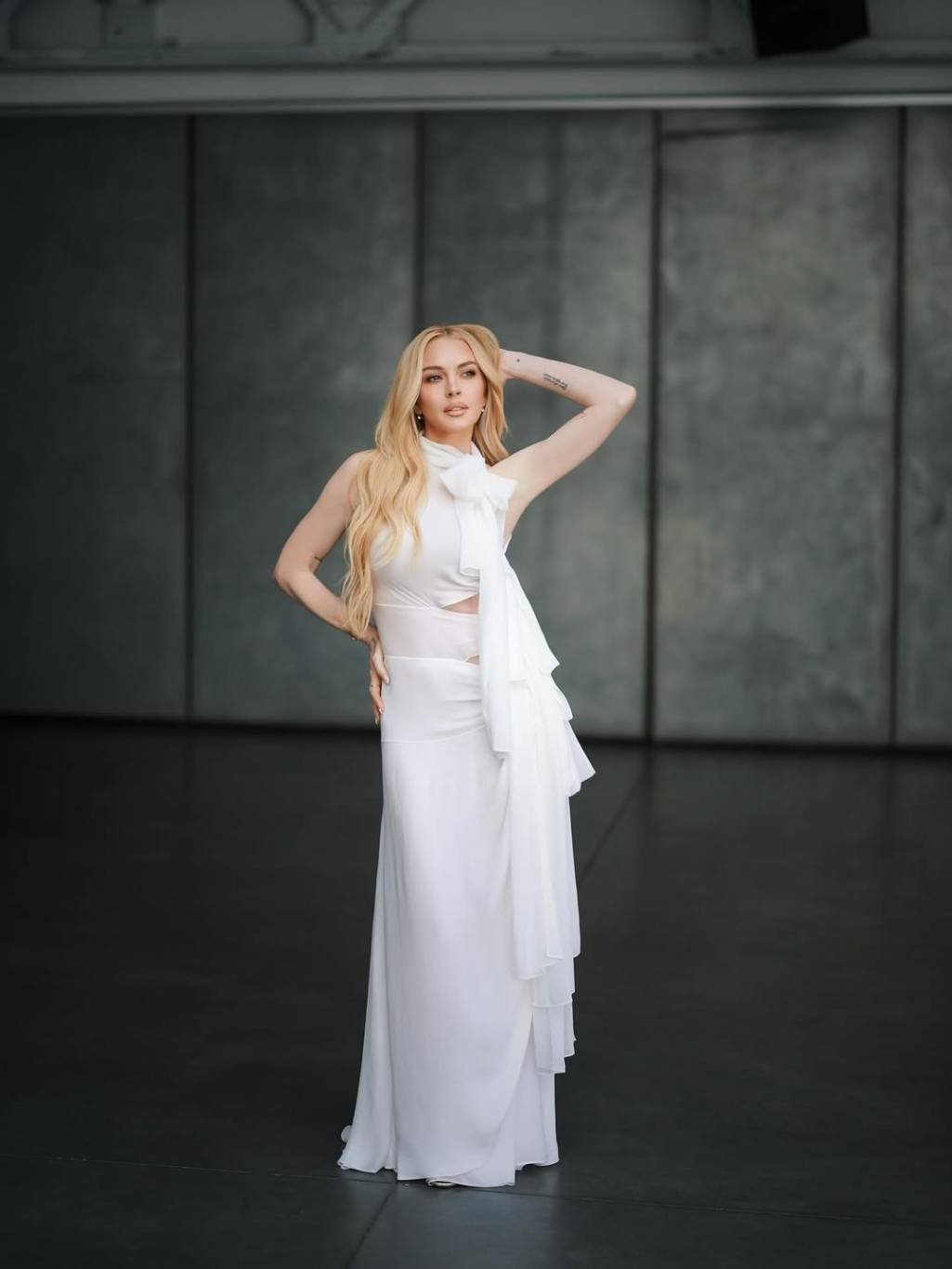أبهرت الممثلة، البالغة من العمر 39 عامًا، معجبيها على إنستغرام، حيث بدت لوهان متألقة وهي تجرب العديد من الوضعيات المختلفة وهي ترتدي فستانًا أبيض رائعًا بياقة عالية مربوطة على شكل فيونكة وفتحتين على الجانب الأيسر.