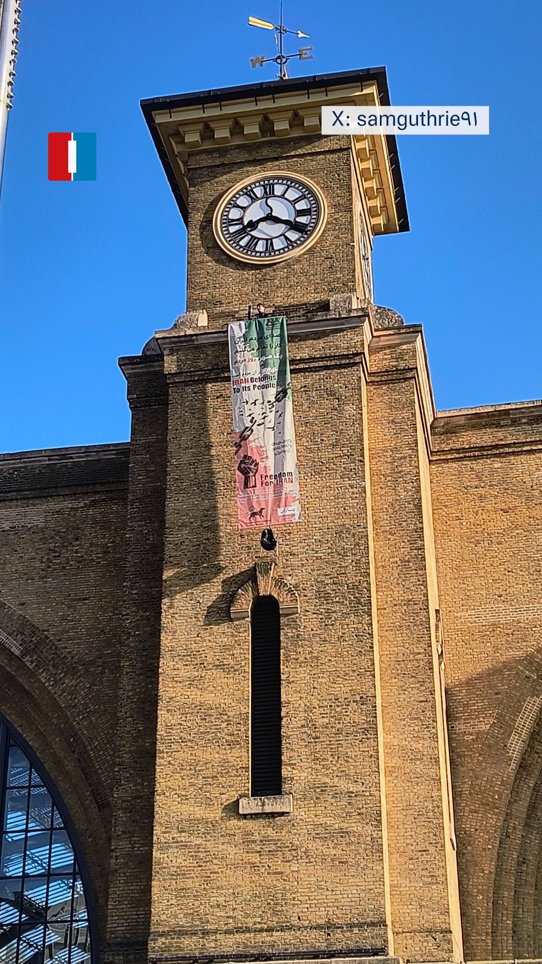 أظهر مقطع فيديو متظاهرًا يحمل كلبًا صغيرًا يقف أعلى برج الساعة في محطة “كينغز كروس” بلندن، بعد أن نشر علمًا يحمل شعارات مناهضة للنظام الإيراني.