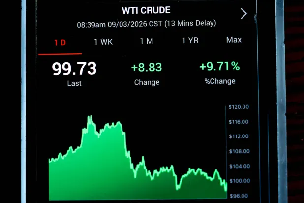 شاشة تلفزيونية تعرض ارتفاع أسعار النفط الخام في حين يعمل المتداولون في بورصة نيويورك (إ.ب.أ)
