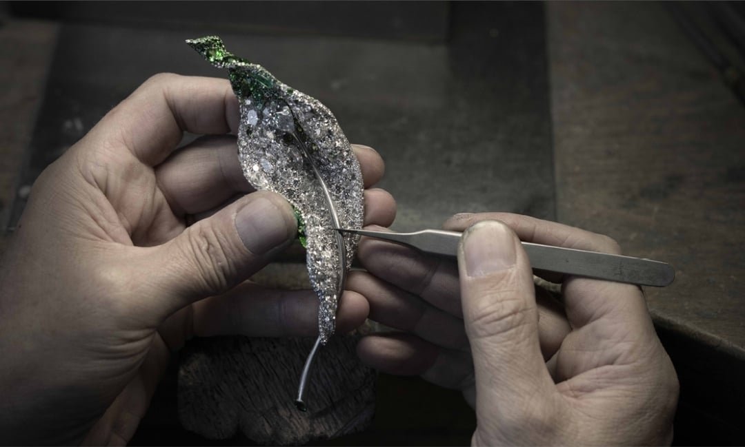 أما بروشات أوراق القيقب فتلتقط لحظة عابرة من ضوء الشمس عبر ورقة واحدة. ببنية ثلاثية الطبقات، وأكثر من ألفَي حجر كريم مرصوفة بدقة وتدرّجات لونية متقنة، تبدو القطع وكأنها تتنفس مع تغيّر الضوء. في هذا التوازن بين السكون والحركة، تؤكد سيندي تشاو قدرتها على تجميد الزمن داخل شكل ثابت، ومنح الحياة صوتاً بصرياً يتلألأ في كل زاوية.