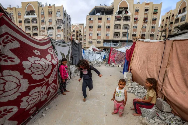 أشخاص يمرون أمام خيامٍ تؤوي نازحين في خان يونس جنوب غزة (أ.ف.ب)