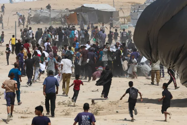 فلسطينيون يركضون نحو مساعدات أُسقطت جواً في دير البلح وسط قطاع غزة (أ.ب)