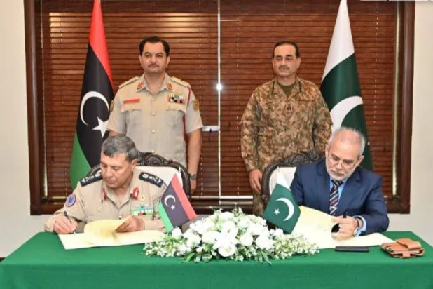 وكانت وكالة «رويترز» قد أفادت بأن الاتفاق جرى توقيعه عقب اجتماع جمع عاصم منير، قائد الجيش الباكستاني بالفريق صدام حفتر، نائب القائد العام لـ«الجيش الوطني» خلال زيارته الأخيرة إلى بنغازي، وذلك في مؤشر على تغيير محتمل في مقاربة بعض القوى لملف التسليح الليبي.