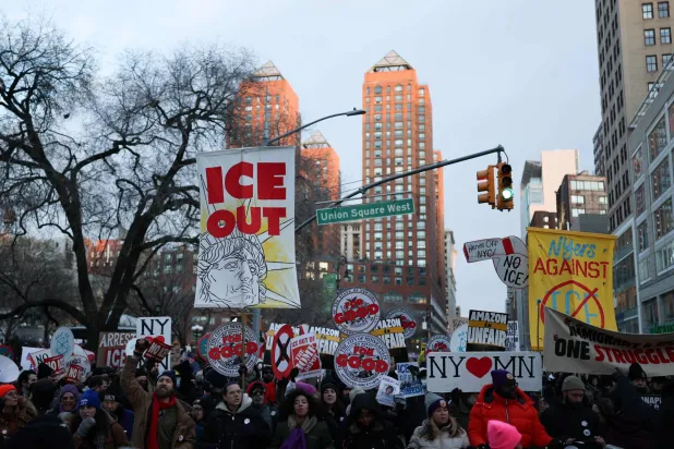 متظاهرون يتضامنون مع مدينة مينيابوليس احتجاجاً على الرئيس الأميركي دونالد ترمب وإدارة الهجرة والجمارك في مدينة نيويورك (رويترز)