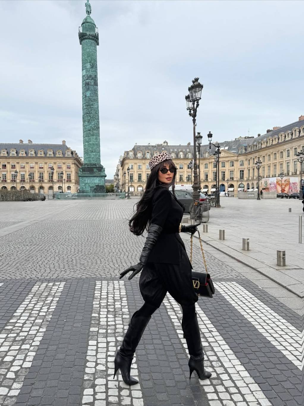 وأكملت نور إطلالتها الباريسية الجميلة بقفازات طويلة من الجلد الأسود لتتماشى مع الأجواء، ووضعت قبعة مستديرة من الصوف بنقسة الفهد باللونين البيج والأسود. وكذلك حملت في يدها حقيبة سوداء ناعمة من دار Valentino.