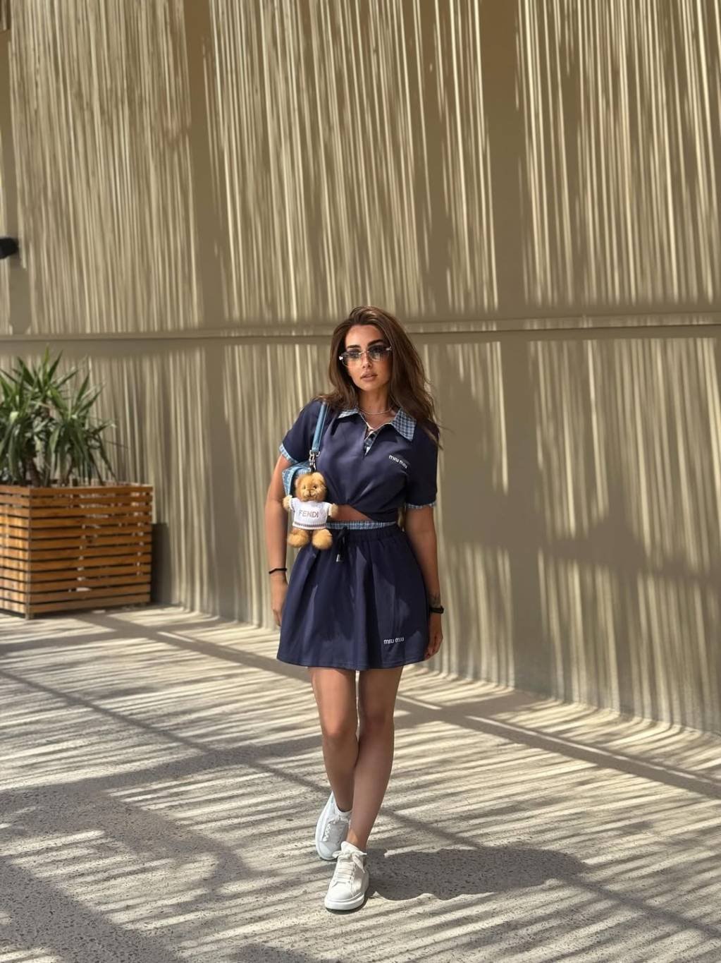 واختارت الفنانة المصرية طقم كاجوال باللون الكحلي من مجموعات MiuMiu الصيفية، عبارة عن تنورة “كلوش” قصيرة تصل الى أعلى الركبة بتصميم ملابس لاعبات التنس مع “توب” قصيرة مع زمزمة ناعمة تكشف عن بطنها، وتتميز بقبة تشبة القمصان الرسمية، وأضيف قماش باللون الأزرق والأبيض على الأطراف، لي حركة أضافت لمسة من الأنوثة والأناقة.