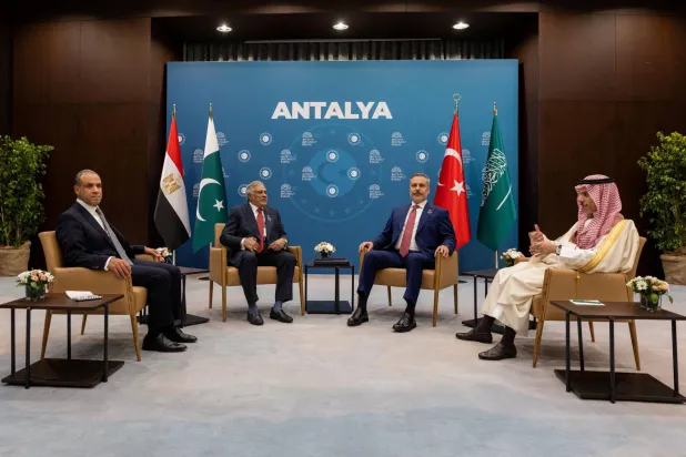 وعقد وزير الخارجية التركي ونظراؤه السعودي فيصل بن فرحان، والمصري بدر عبد العاطي، والباكستاني محمد إسحاق دار، اجتماعاً مساء الجمعة، على هامش الدورة الخامسة لـ«منتدى أنطاليا الدبلوماسي»، لبحث سبل إيجاد حلول للمشكلات الإقليمية، وفي مقدمتها الحرب بين الولايات المتحدة وإسرائيل وإيران، في إطار مبدأ «الملكية الإقليمية» الذي يقوم على مساعي حل مشكلات المنطقة من دون تدخل أجنبي.