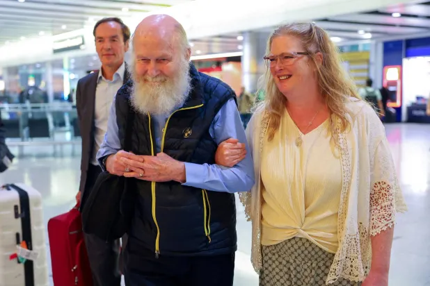 الزوجان البريطانيان بيتر وباربي رينولدز، اللذان أُفرج عنهما من احتجاز طالبان في أفغانستان، يصلان إلى مبنى الركاب رقم 4 بمطار هيثرو في لندن الكبرى، بريطانيا، 20 سبتمبرأيلول 2025 (رويترز)