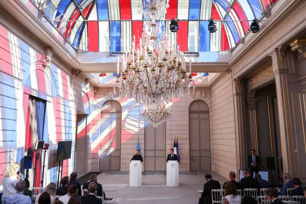 الرئيس الفرنسي إيمانويل ماكرون مستقبلاً رئيسة المفوضية الأوروبية أورسولا فون دير لاين على مدخل قصر الإليزيه (أ.ب)