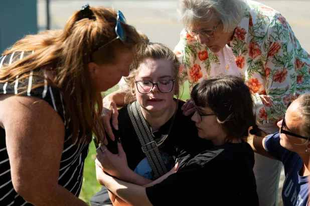 ناجون من هجومٍ استهدف كنيسة تابعة لطائفة «المورمون» بولاية ميشيغن الأميركية يلتقون أقاربهم وأصدقاءهم في مكان قريب من موقع الحادث (أ.ب)